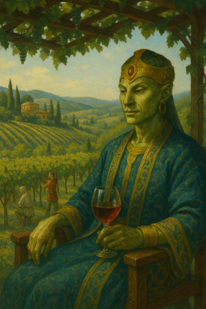 Music is ever-present: reed flutes, hand drums, and the soft chime of metal ornaments stitched into dancers’ garments. Wine is a focal point of any evening. The local vintage reigns supreme, as every town of repute has a vineyard or two to mirror the great Enclave of the capital, but merchants keep a steady supply of new vintages (and news) flowing through taverns and boathouses.